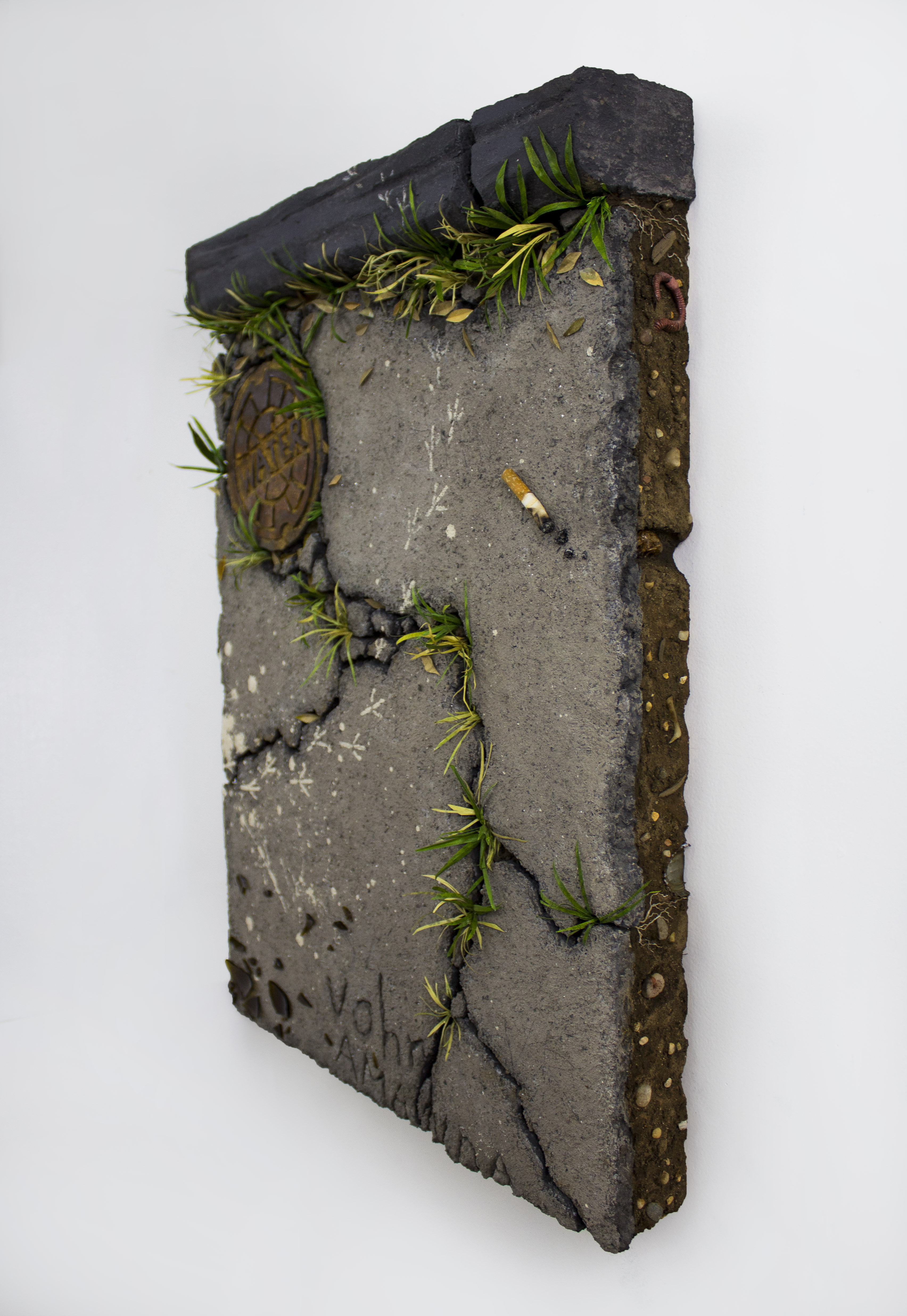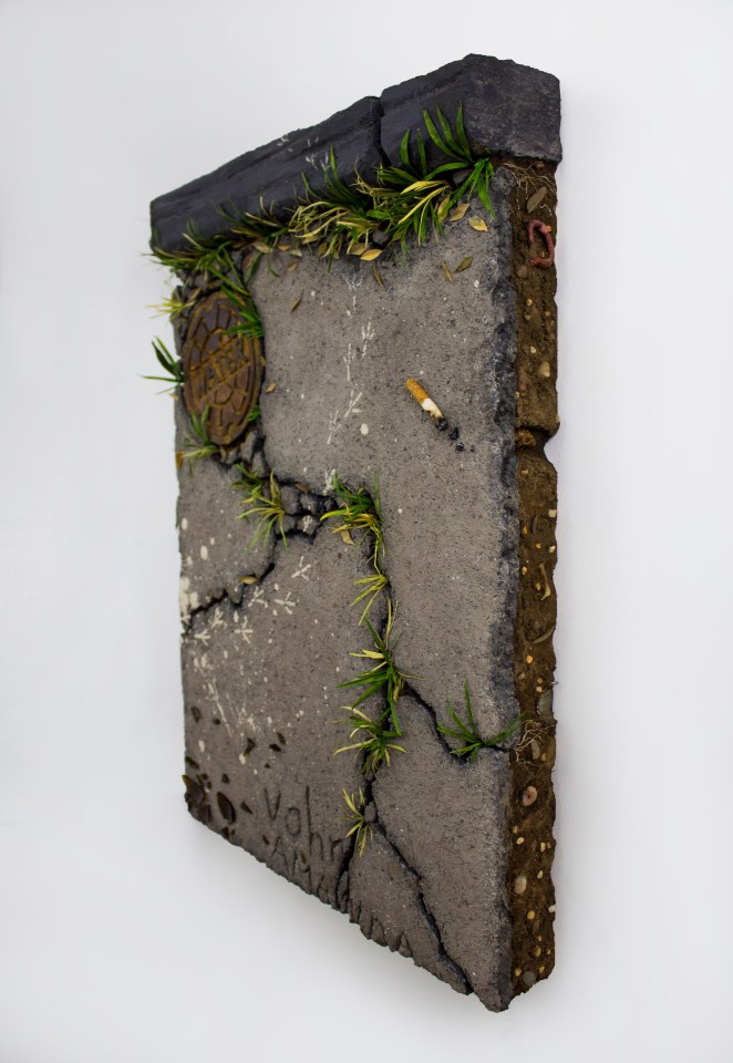 Brooklyn Sidewalk : August 2021 (side view). 2021. Acrylic, junk mail, dirt, gravel, broken beer bottle, polymer clay, styrofoam, string, cicada exoskeleton. 24.5 x 18 x 4 in.