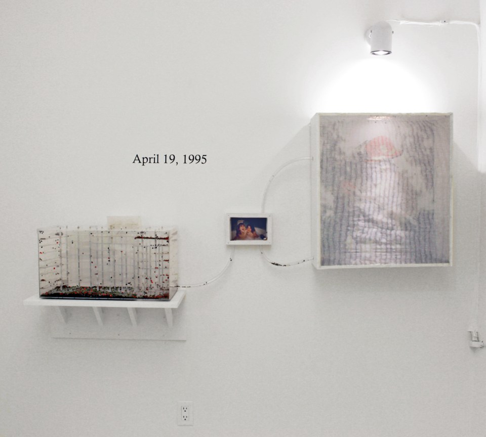 Fly Away Home 8 ← Previous Next → Fly Away Home. 2012. Kinetic sculpture made of Plexiglas replica of the Murrah Building, wood, medical tubing, photographs, and hundreds of live ladybugs. Dimensions variable. Like Loading...