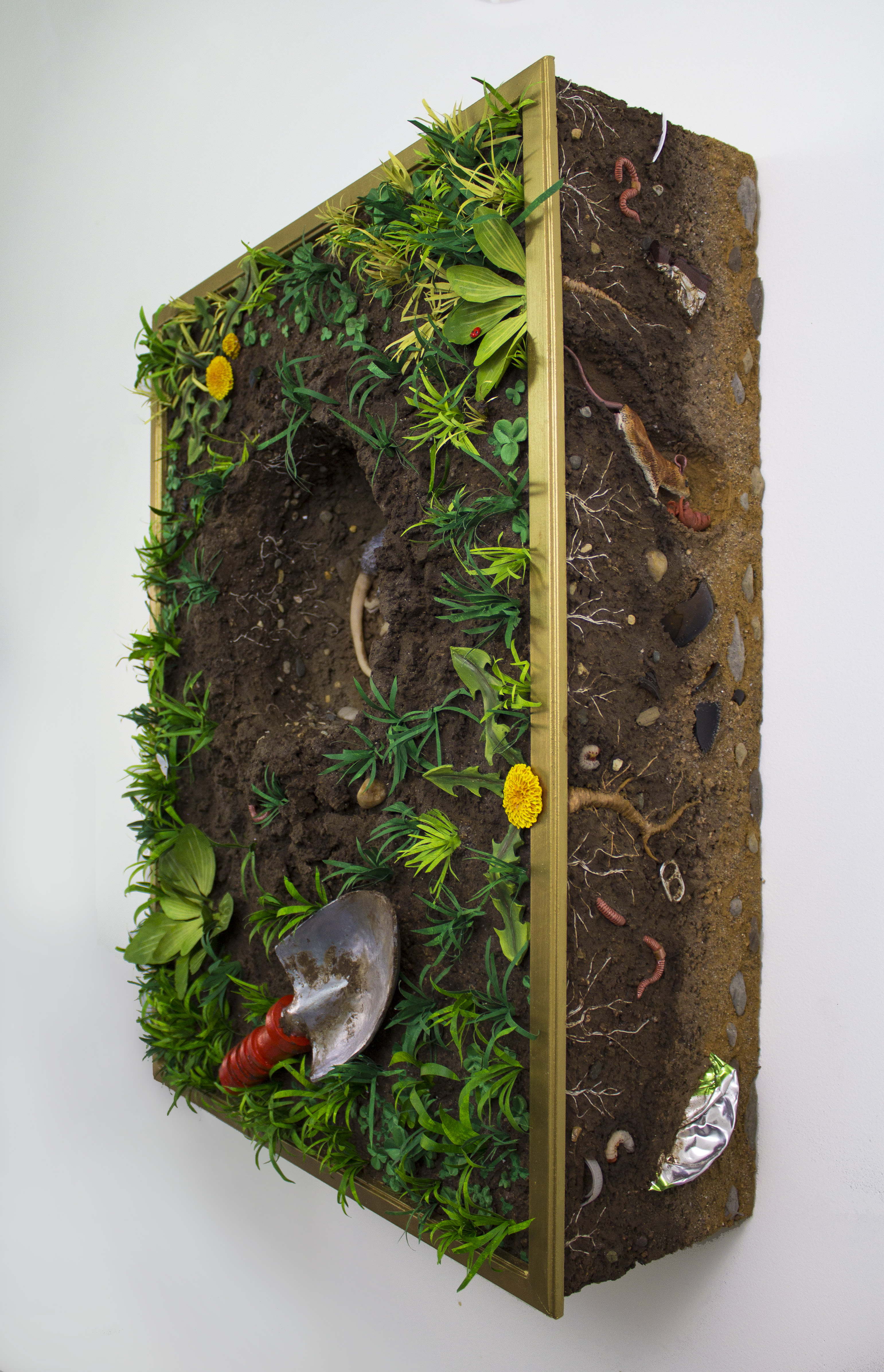 Funeral for a Baby Possum (side view). 2022. Wood, Styrofoam, acrylic, paper, polymer clay, dirt, rocks, litter, cicada exoskeletons, June bug. 25 x 21 x 8 in.