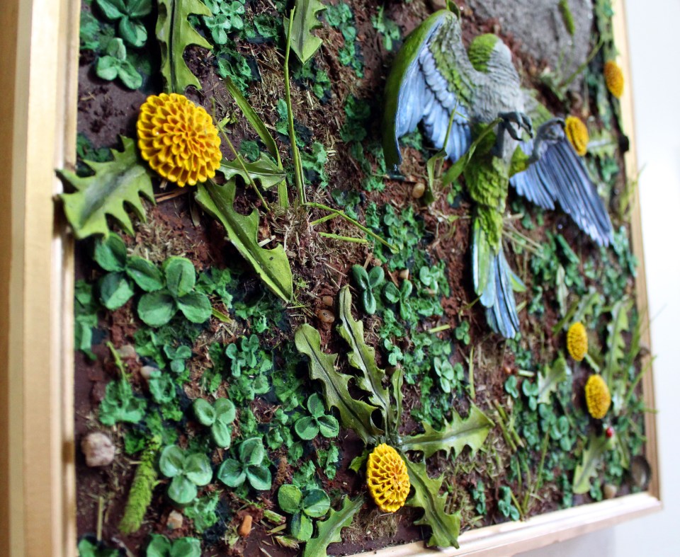 Gertie (detail shot). 2020. Acrylic, polymer clay, dirt, rocks, hay, broken glass, bottle caps, cicada exoskeleton, wood panel. 24 x 20.5 x3 in.