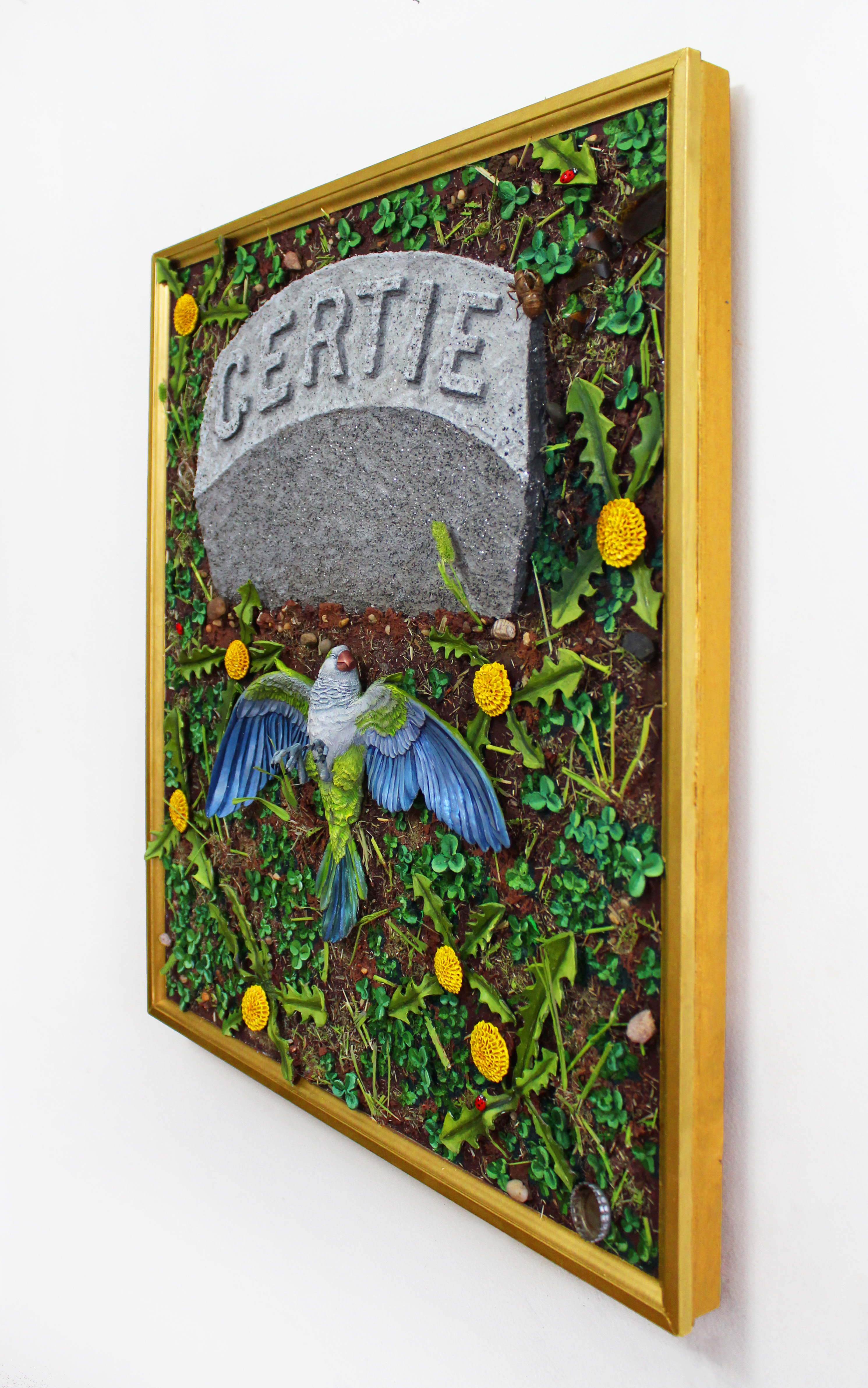 Gertie (side view). 2020. Acrylic, polymer clay, dirt, rocks, hay, broken glass, bottle caps, cicada exoskeleton, wood panel. 24 x 20.5 x3 in.