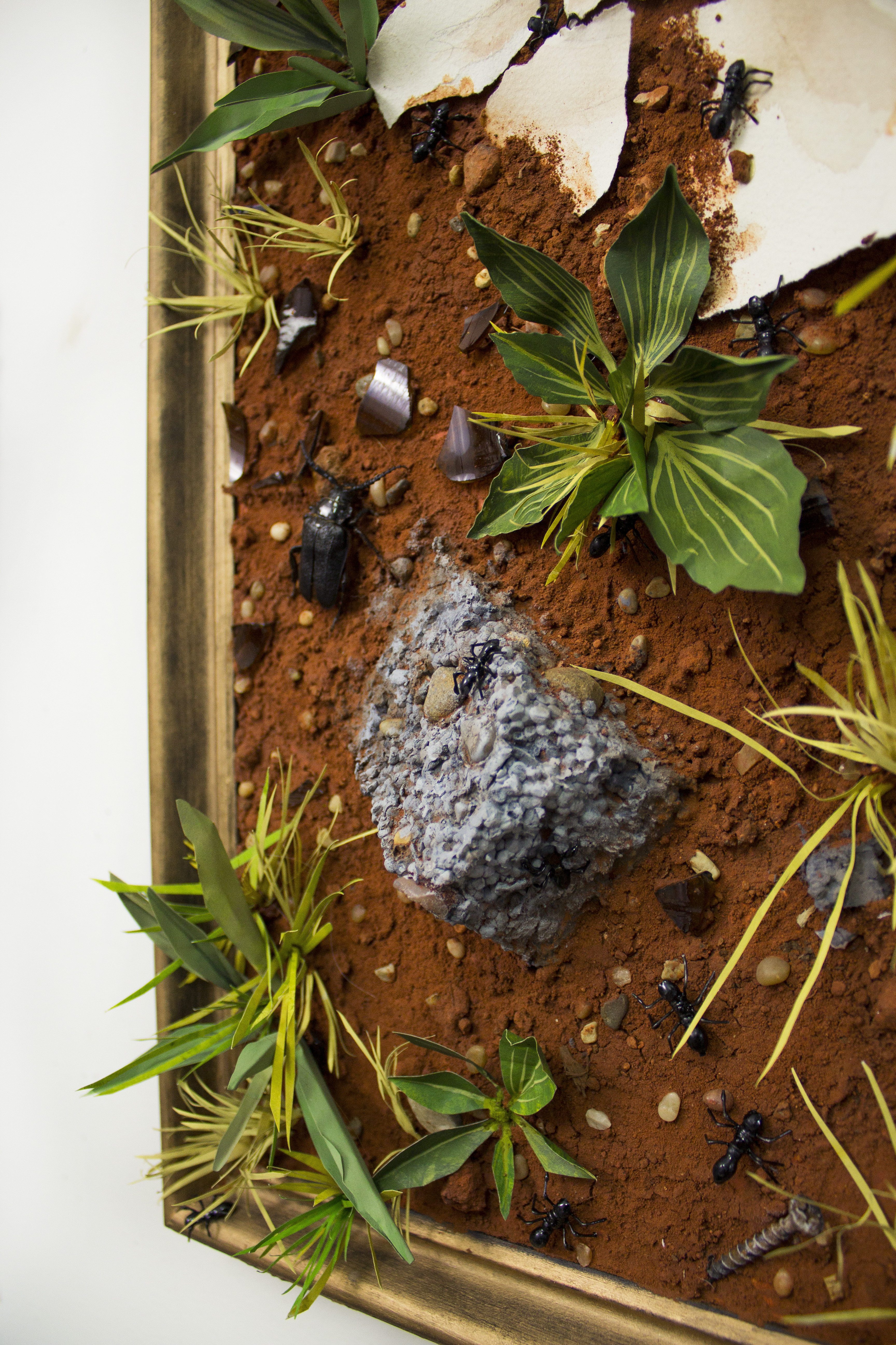 Self Portrait in Red Dirt (detail shot). 2021. Acrylic, watercolor, Oklahoma dirt, paper, rocks, shattered beer bottle, broad-necked root borer beetle, styrofoam, wire, wood. 28.5 x 20 x 4 in.
