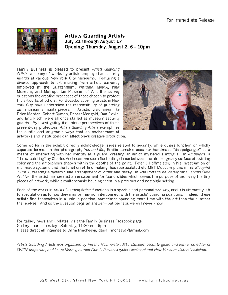 From the 24th – 28th will be an OPEN CALL for artists and performers in the Family Business community to bring a ready-made piece to the gallery and make a sales pitch for your art. Let us know about your work, show us all it’s special features, tells us if it slices, dices, and shows us what it is to be a human. We have the equipment to capture you on film, you just have to bring the wit, and sell baby, sell!!!